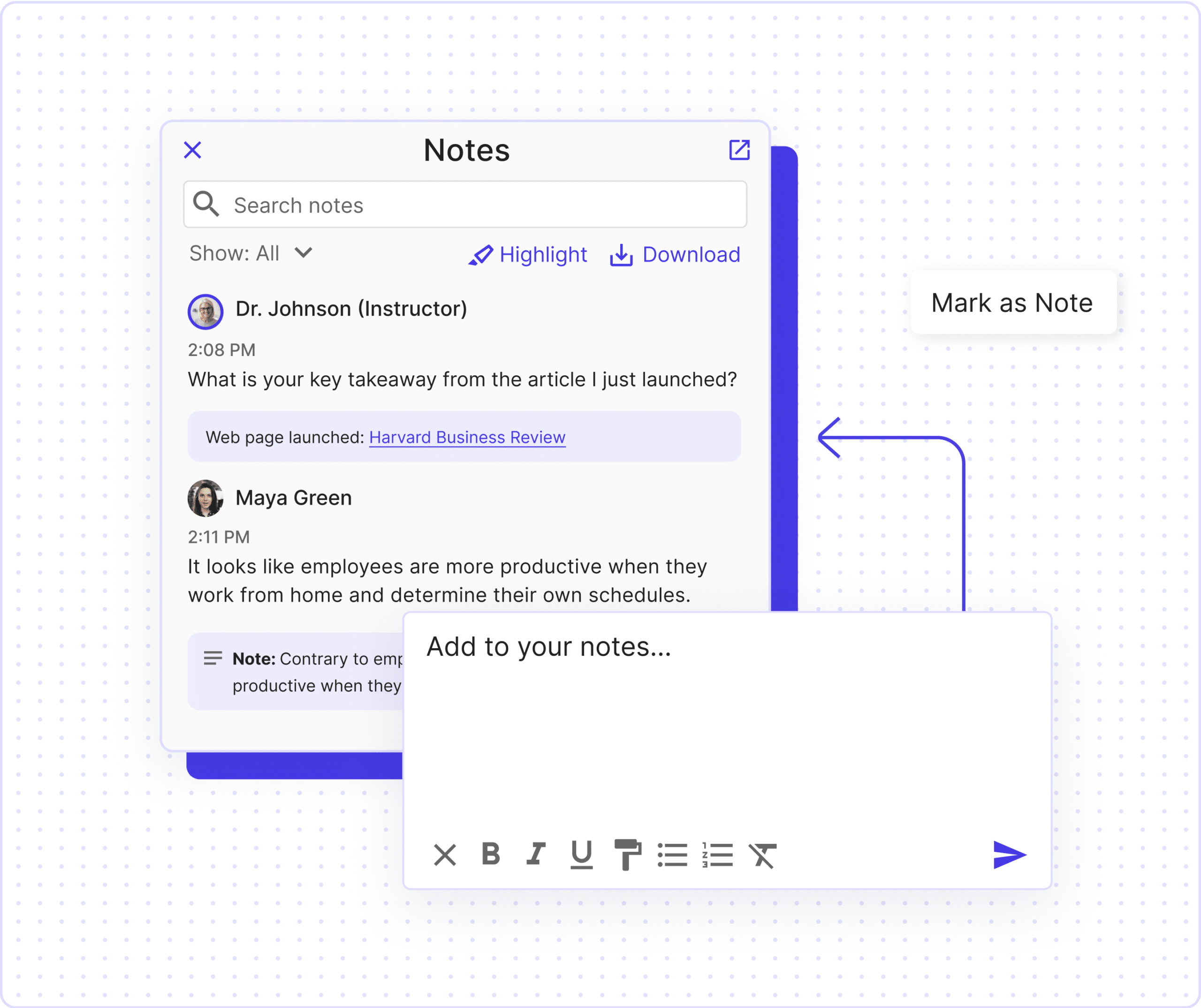 Class’s interactive note-taking feature takes course transcriptions to the next level—allowing learners to better organize ideas and information. Class gives learners the tools to capture, curate, and crystalize their learning seamlessly.