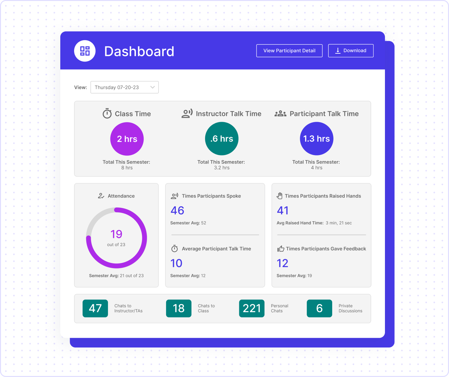 Seamlessly track and report on real-time engagement and session analytics. With our in-session data dashboard, instructors can measure and report on course efficacy and improve the outcomes of their instruction.