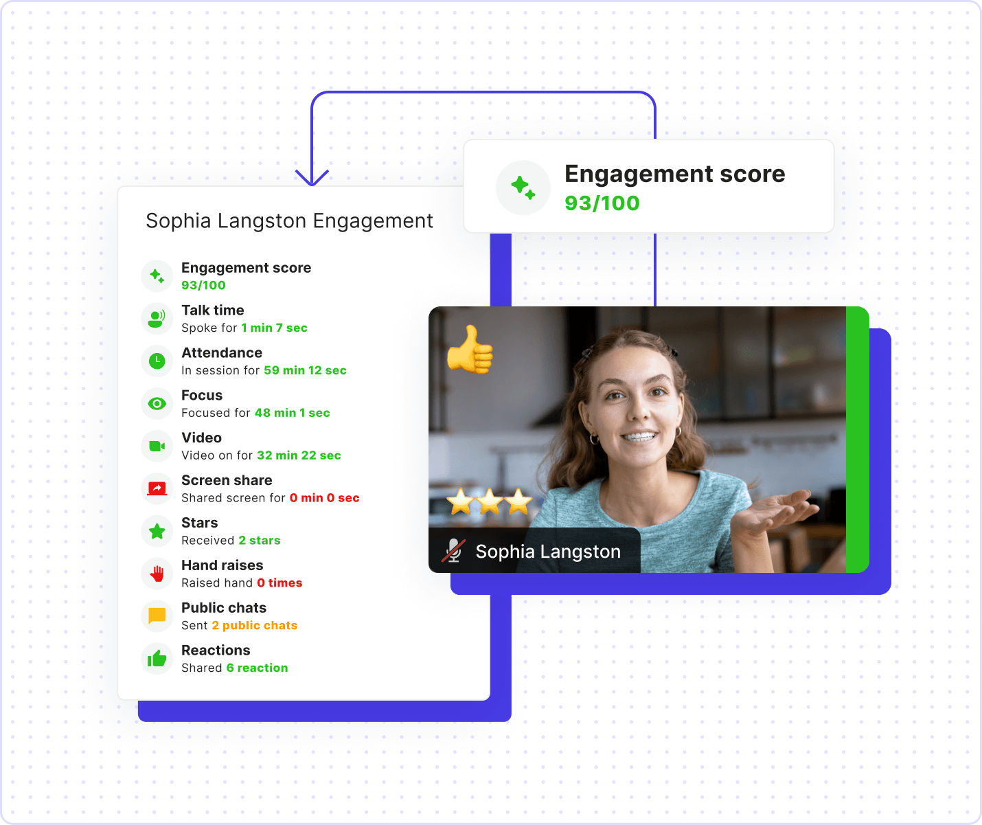 Learner Engagement Scoring gives instructors a clear, data-driven view of engagement by analyzing key participation metrics—like talk time, chat activity, and reactions. With a real-time at-a-glance score, instructors can identify disengaged learners and take action in the moment, creating a more interactive and responsive learning experience for all learners.
