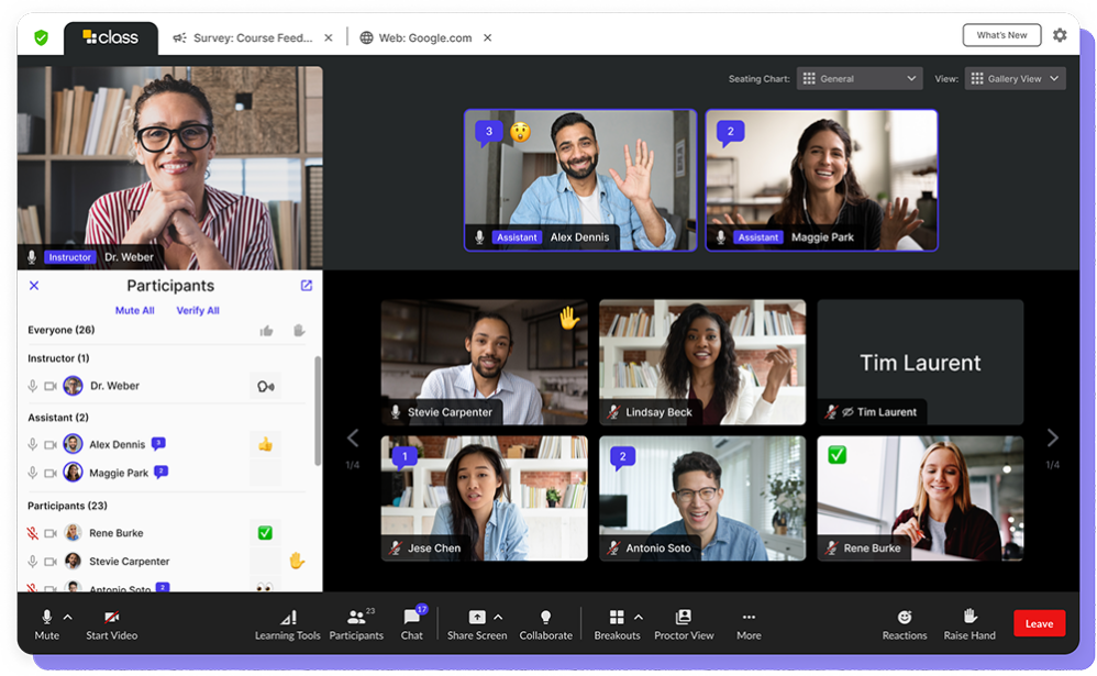 With Class’s “Privacy Mode,” instructors can achieve the always-on camera status that can assist in providing quality instruction. At the same time, learners can secure the privacy they desire by remaining “camera off” to their peers.